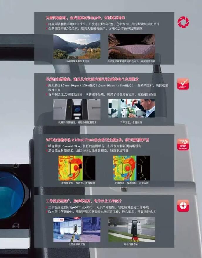 徠卡測量系統(tǒng)打造的長測程三維激光掃描儀ScanStation P50,在繼承高精度的測角測距技術、 WFD波形數(shù)字化技術、 Mixed Pixels混合像 元技術和HDR圖像技術的同時,掃描距離提高至1km以上,使得徠卡ScanStation P50具有更長的測程和更強大的性能,滿足長距離及各種掃描任務需求。